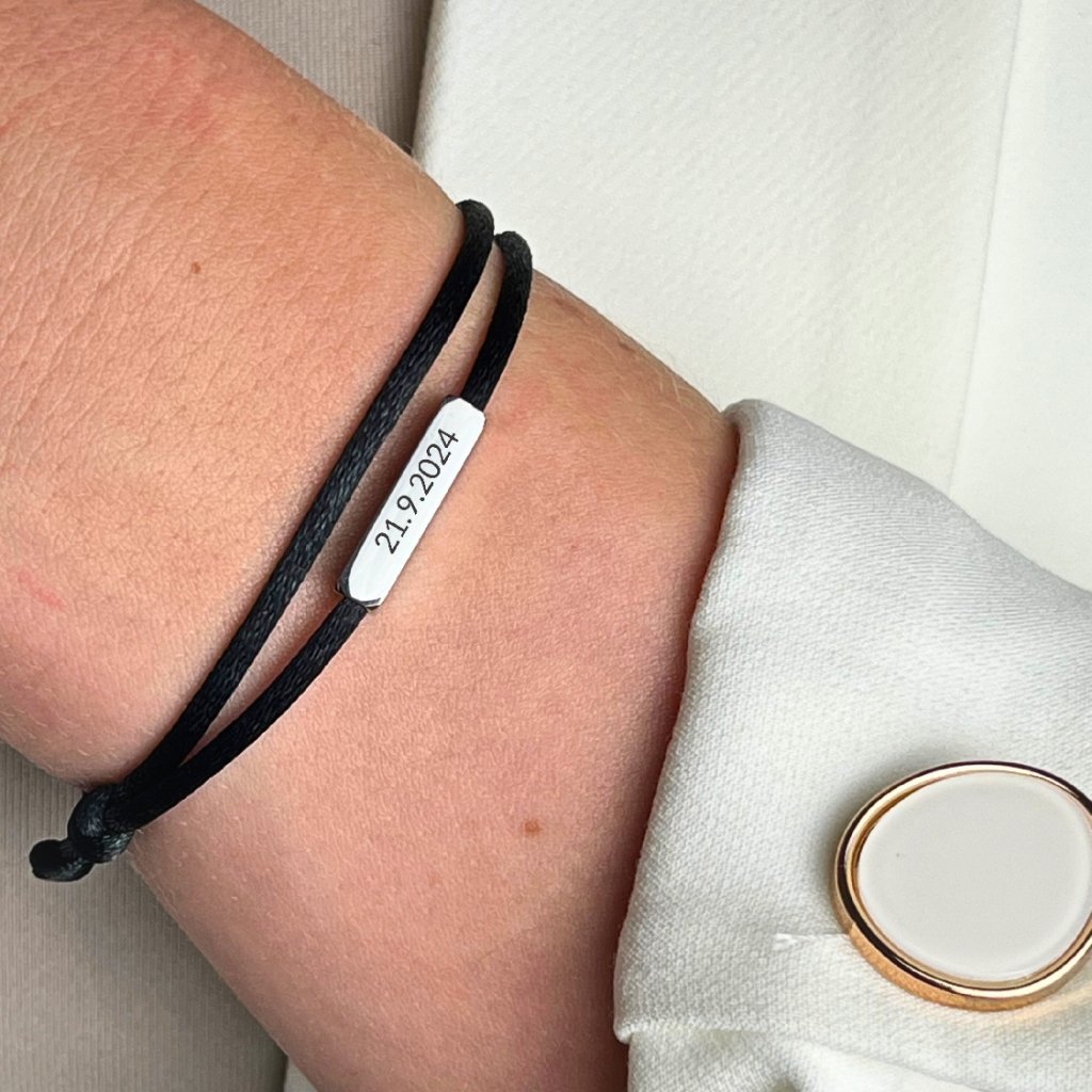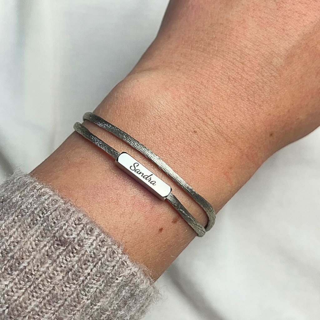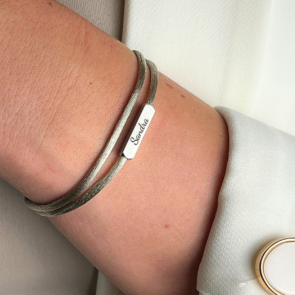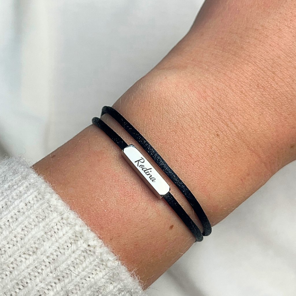 Dámský náramek TUBUS na saténové šňůrce, stříbrná barva.
