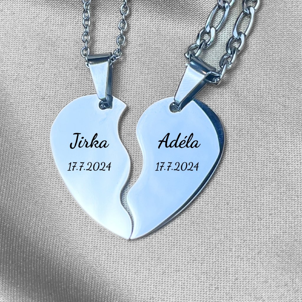 Párové náhrdelníky srdce pro něj a pro ni, stříbrná barva.